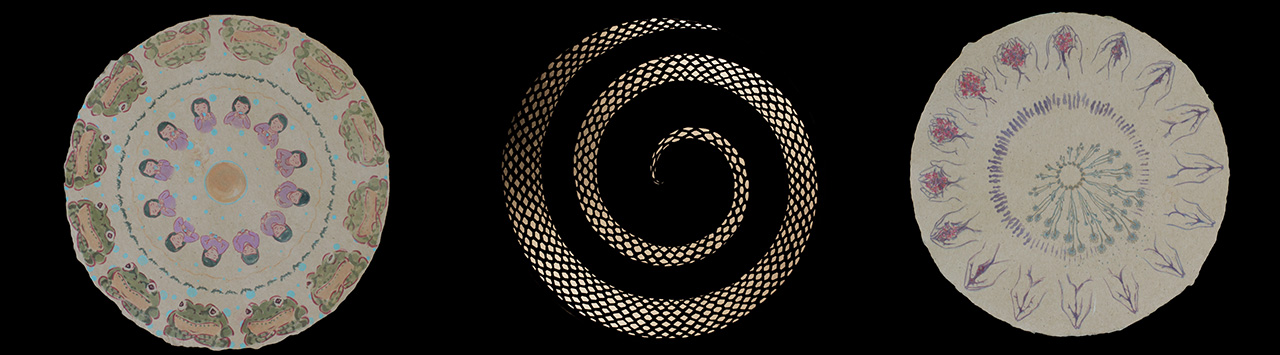 この作品の空間構成は、映画の従来のテクニックの一つであるフェナキストスコープ(回転式アニメーション装置)からなり、24章のアニメーション観る人が実際に体験・操作するようにデザインされています。各章には、二十四節気に寄り添いながら生活する家族の様子が描かれ、自然と共に生きる彼らの毎日を身近に感じられます。