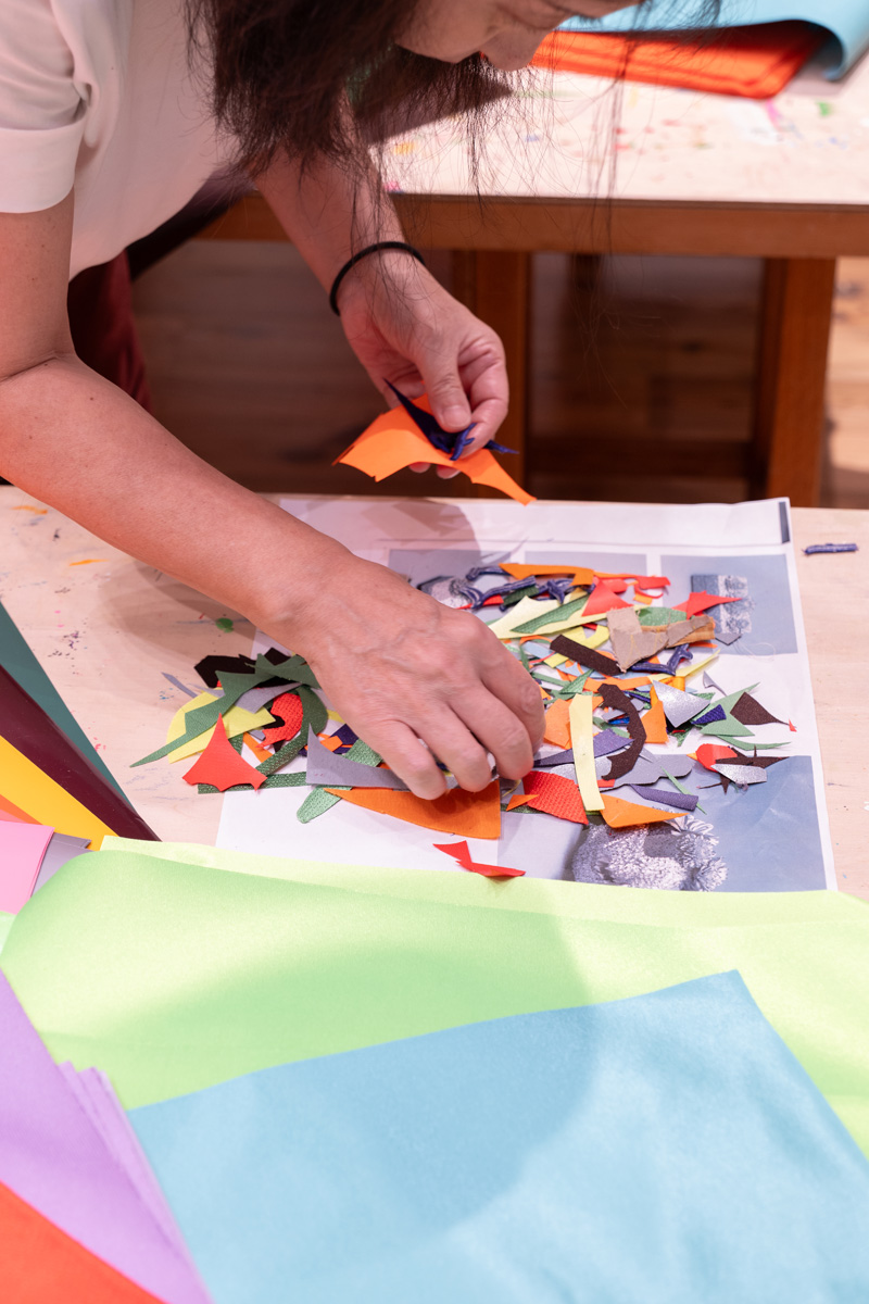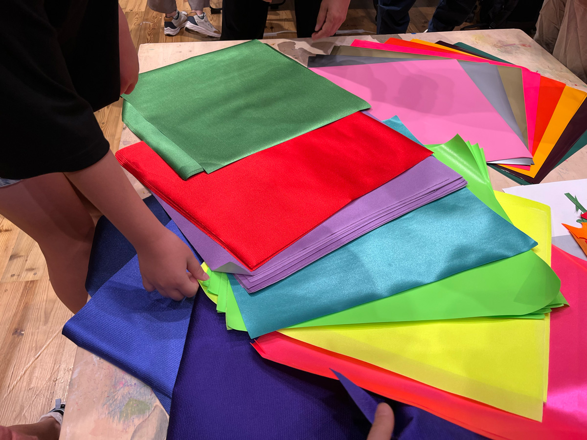 ワークショップの参加者はテキスタイルアーティストのアンドレア・マイヤーズと小林万里子のもと、再利用の布をコラージュし、他の参加者と協力しながら、思い思いのテキスタイルバードを作りあげました。自分ひとりで作るのではなく、あえて他人の手を入れることで、思いがけない面白さや美しさが、作品に生まれています。